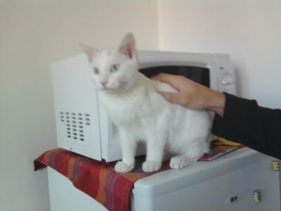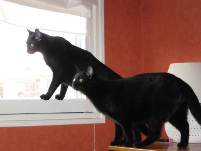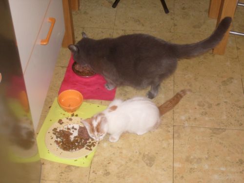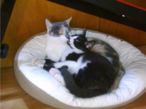 Je vous envoie des photos. Parme n'accepte des calins que de moi, mais personne de l'oublie. Filou, notre chaton, est très respecteux de Parme, et patient, bien qu'il ait l'art de repousser les frontières ce qui ne déplait pas à Parme.